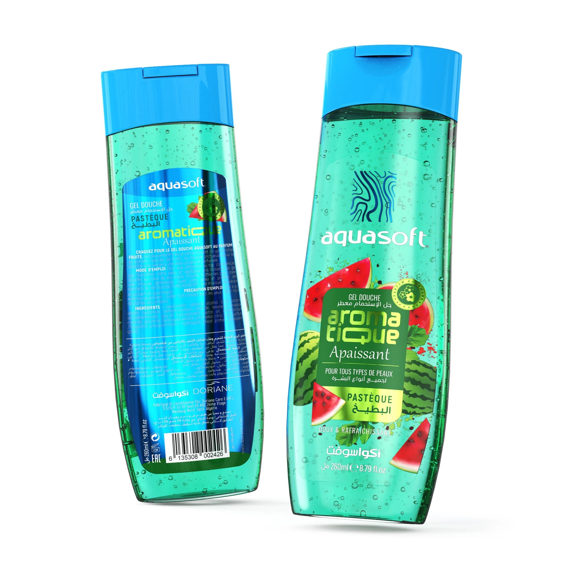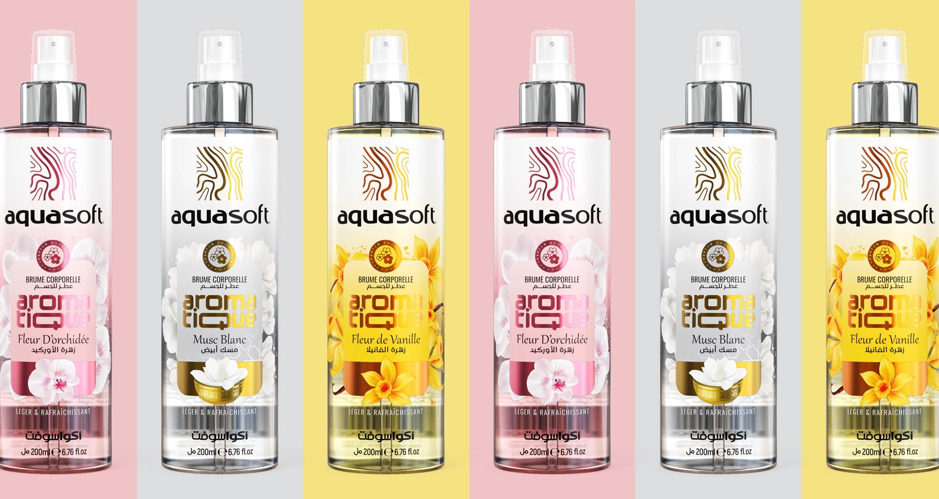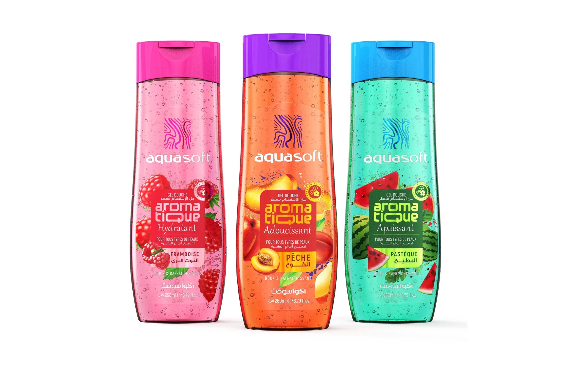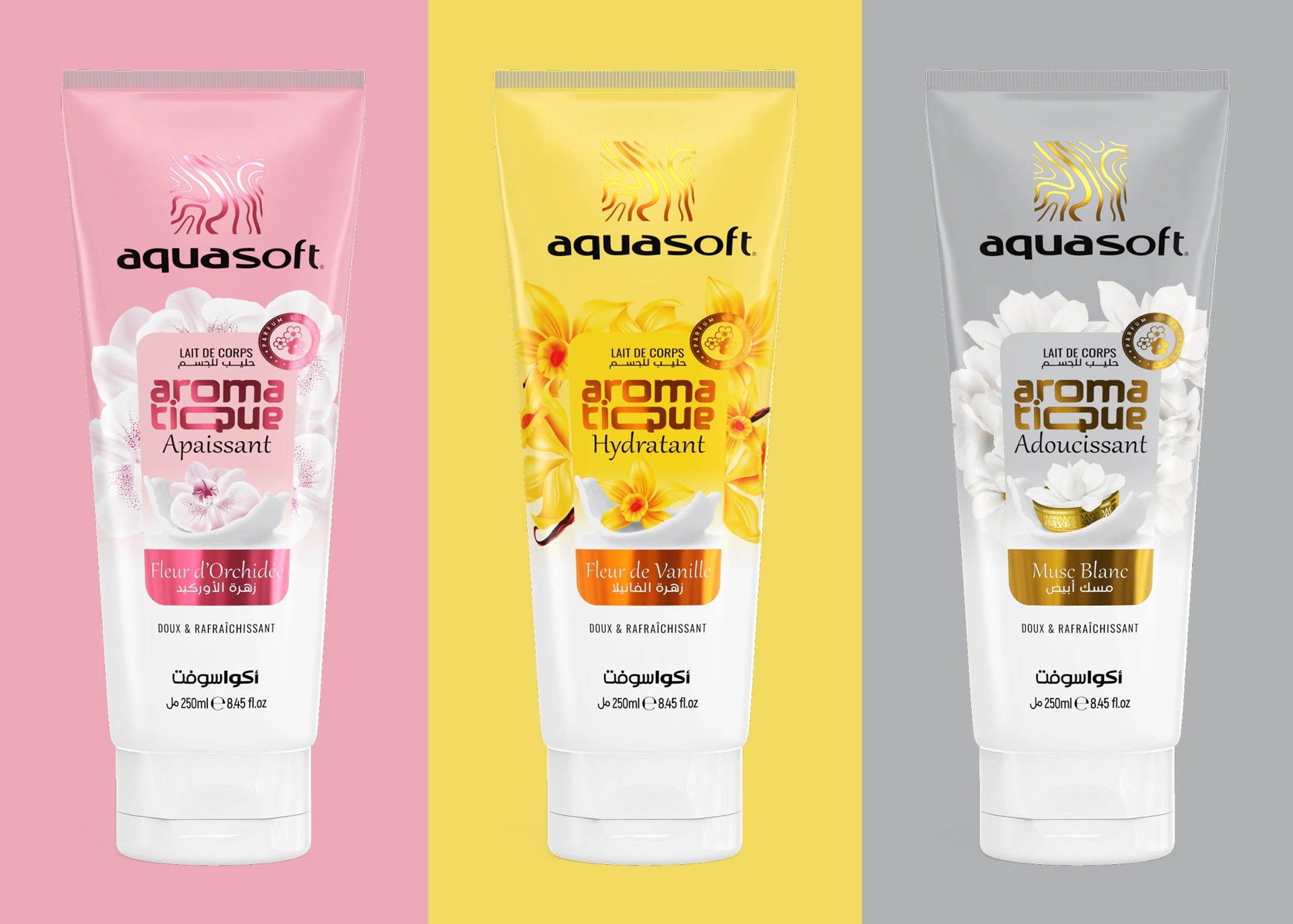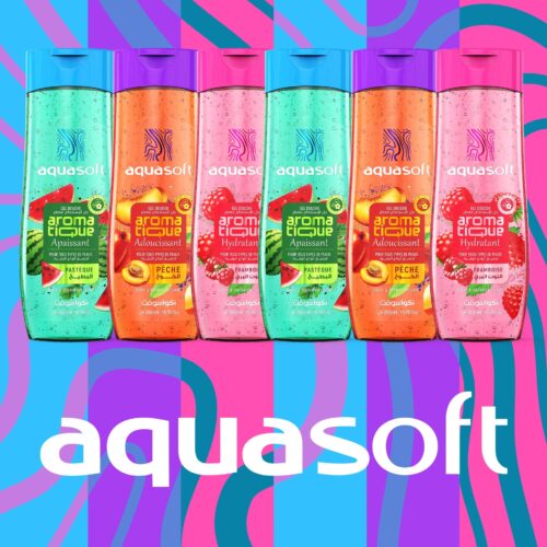 Packaging réalisé pour la gamme de produits cosmétique Aromatique Aquasoft, une gamme de soins corporels qui allie fraîcheur, douceur et hydratation. Le design met en avant des couleurs vives et modernes, reflétant les senteurs uniques et l’univers sensoriel de chaque produit.