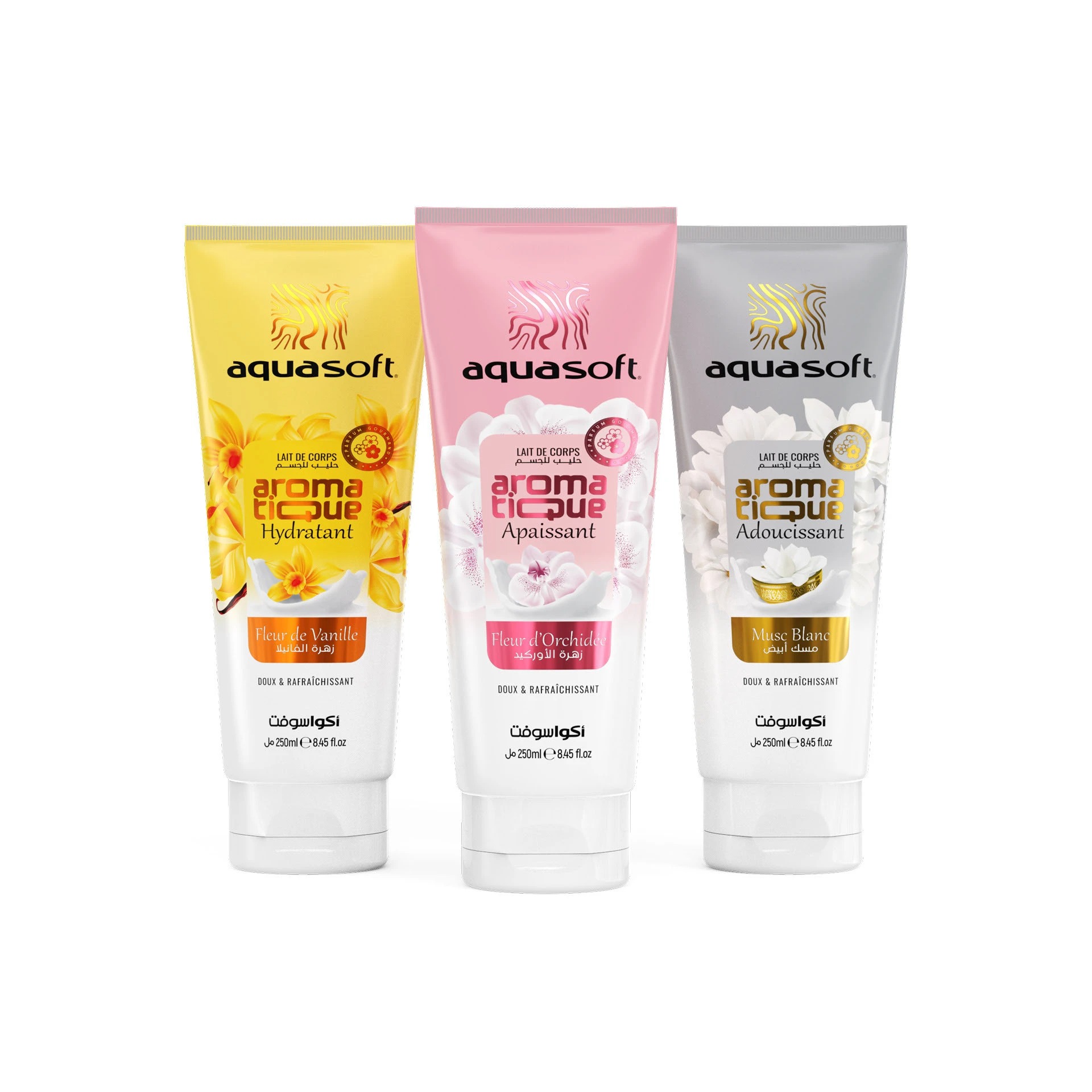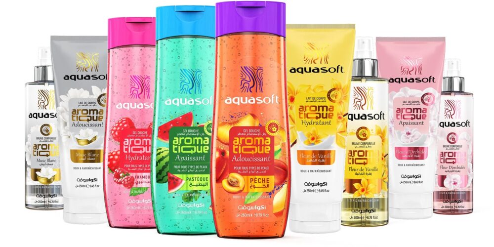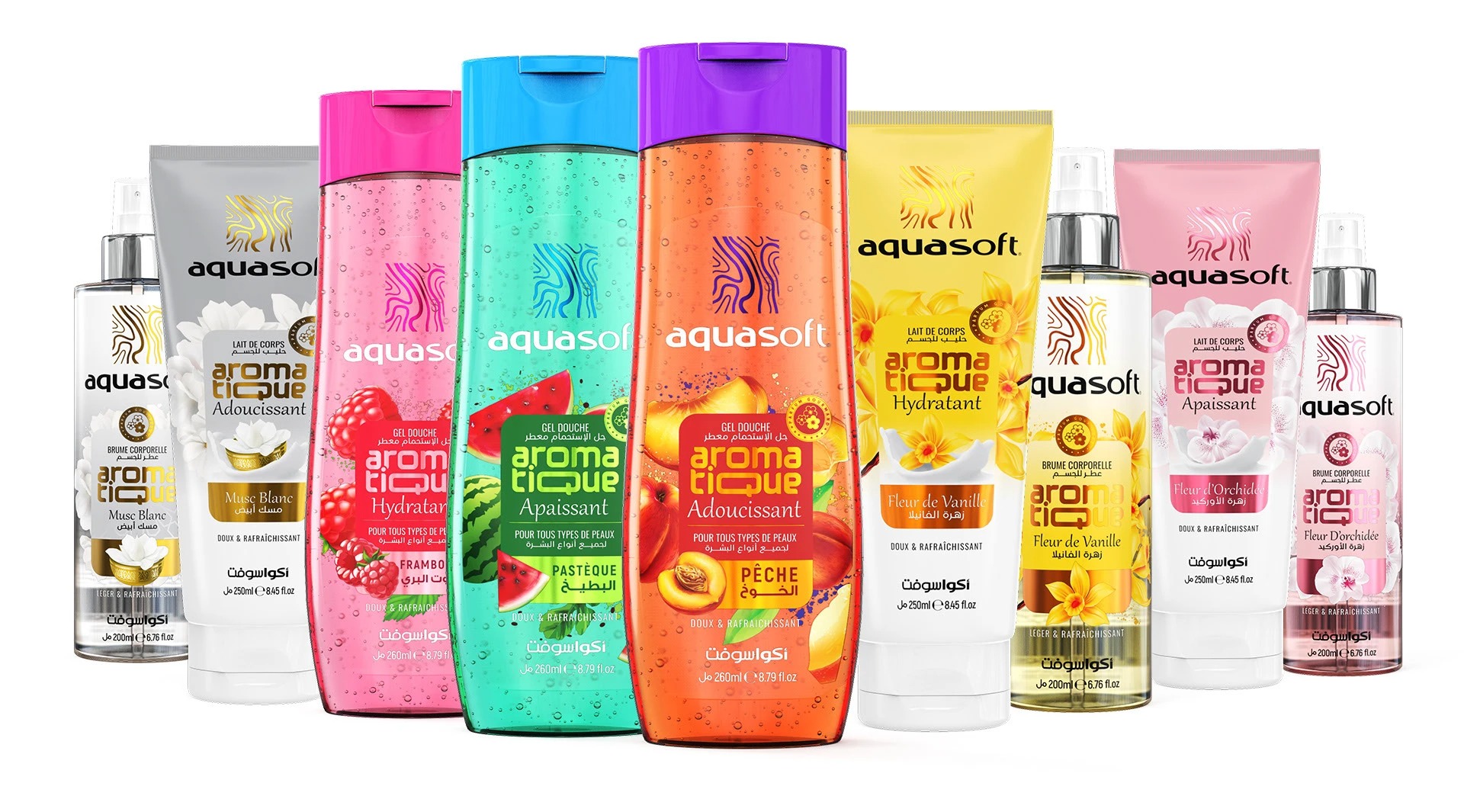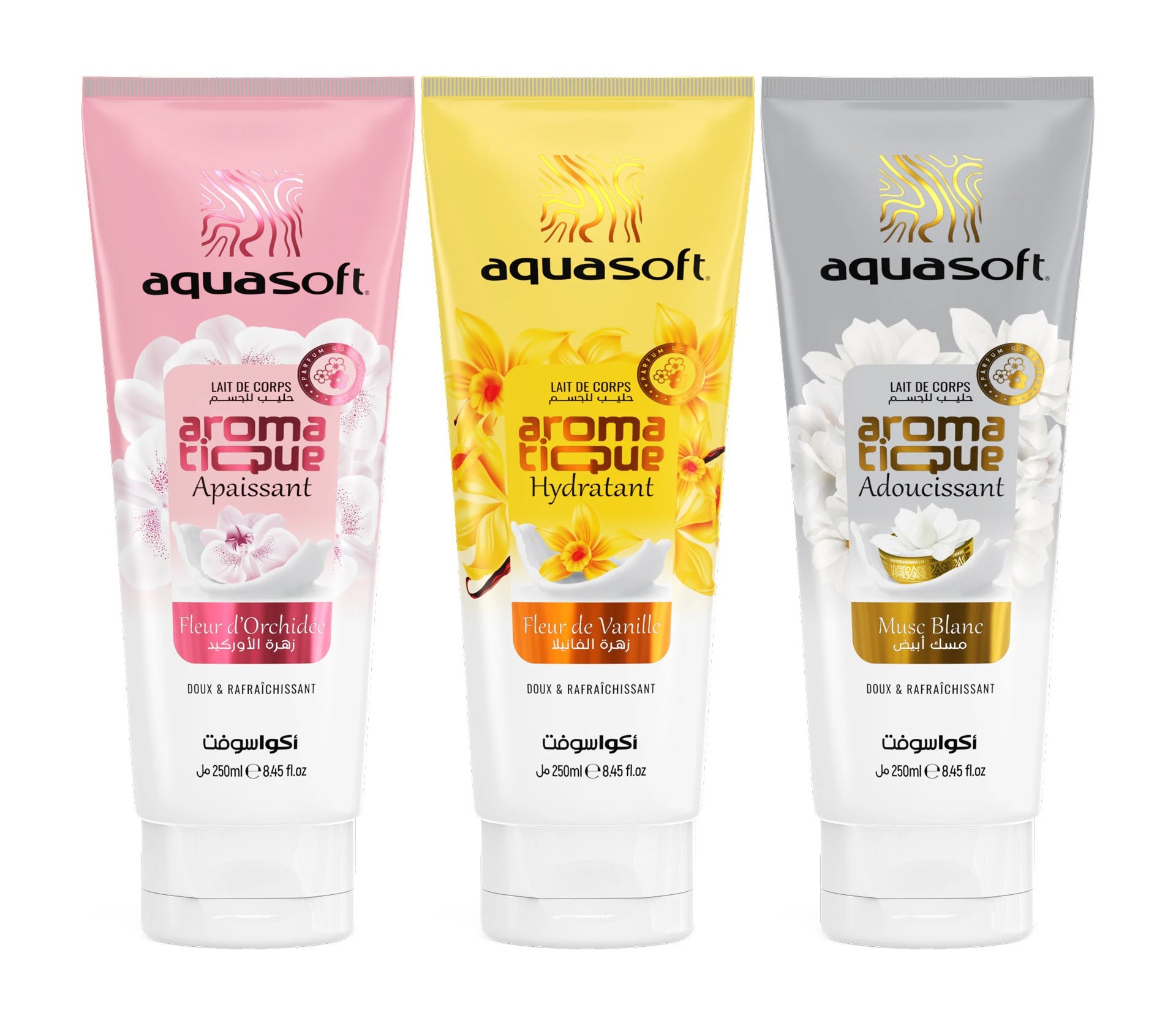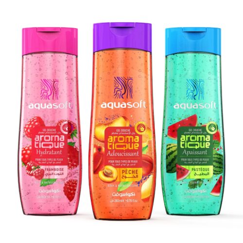 Packaging réalisé pour la gamme de produits cosmétique Aromatique Aquasoft, une gamme de soins corporels qui allie fraîcheur, douceur et hydratation. Le design met en avant des couleurs vives et modernes, reflétant les senteurs uniques et l’univers sensoriel de chaque produit.