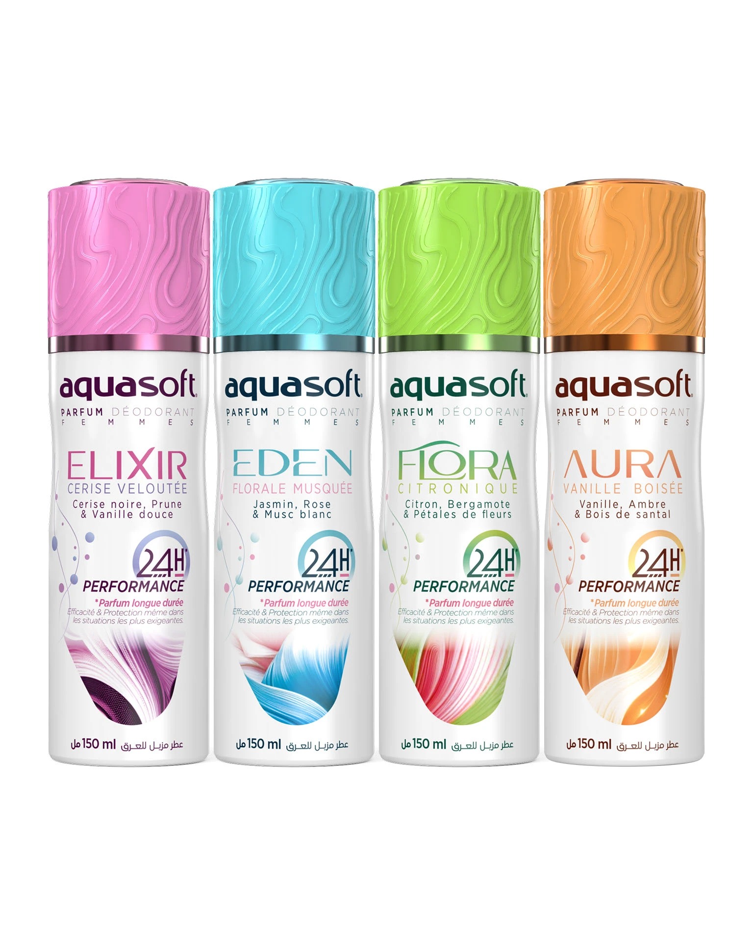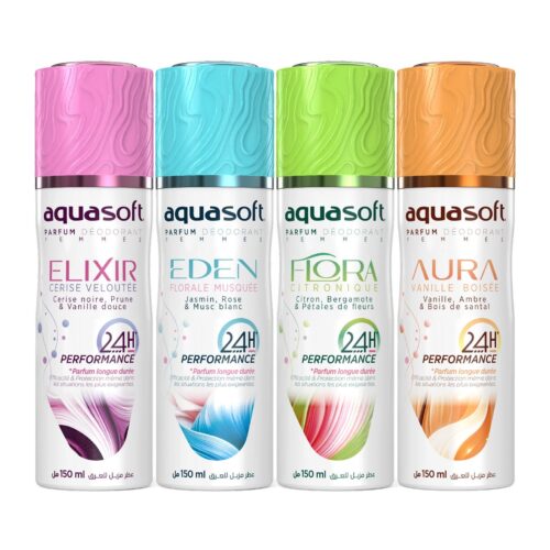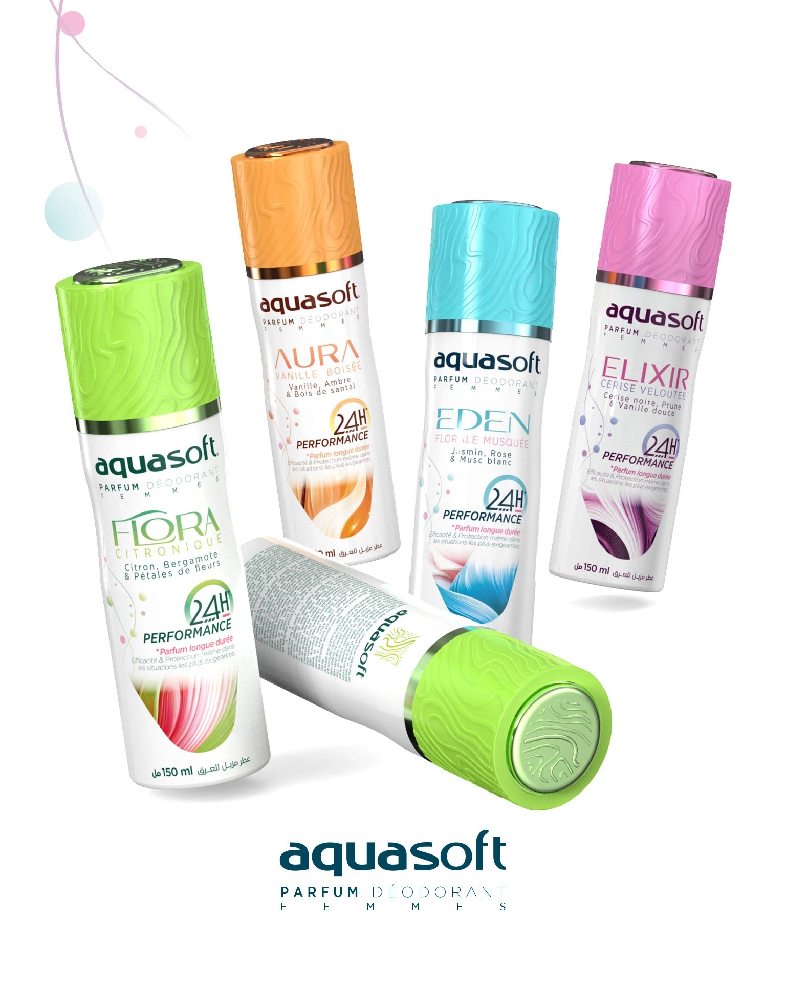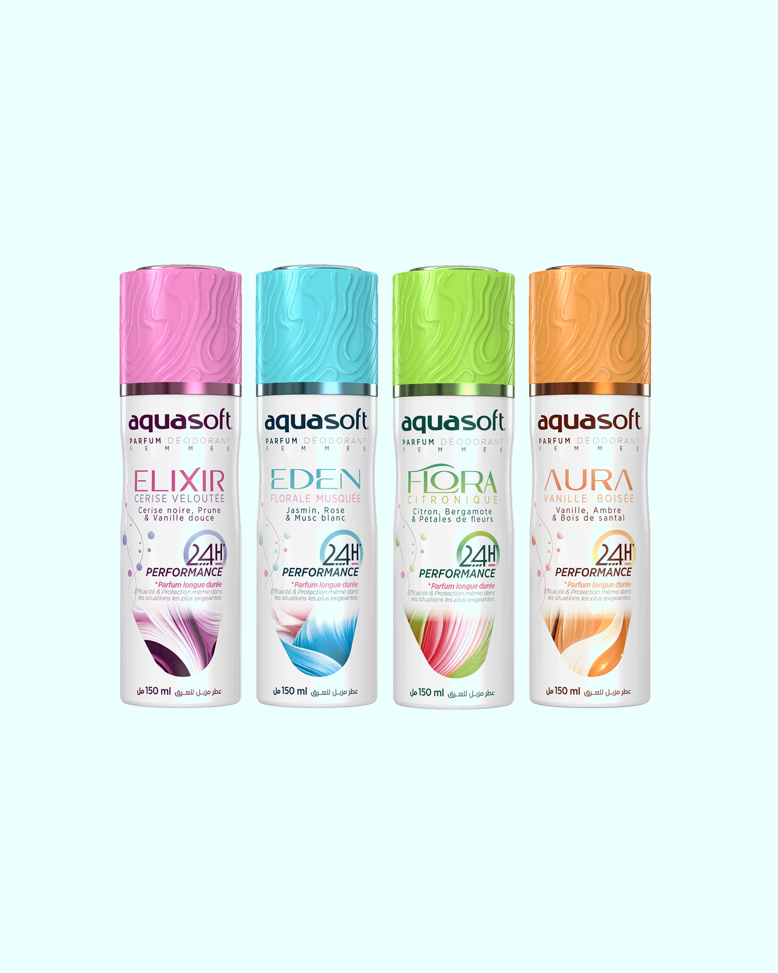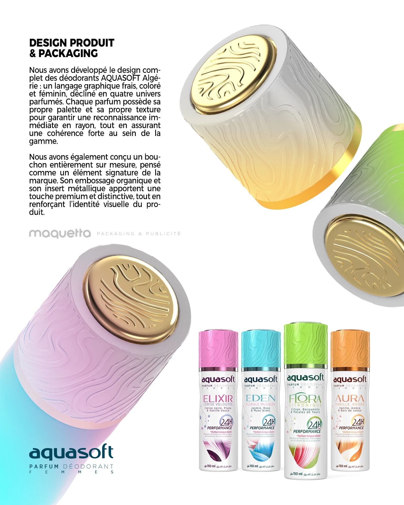 Nous avons développé le design complet des déodorants AQUASOFT Algérie : un langage graphique frais, coloré et féminin, décliné en quatre univers parfumés. Chaque parfum possède sa propre palette et sa propre texture pour garantir une reconnaissance immédiate en rayon, tout en assurant une cohérence forte au sein de la gamme. Nous avons également conçu un bouchon entièrement sur mesure, pensé comme un élément signature de la marque. Son embossage organique et son insert métallique apportent une touche premium et distinctive, tout en renforçant l’identité visuelle du produit.