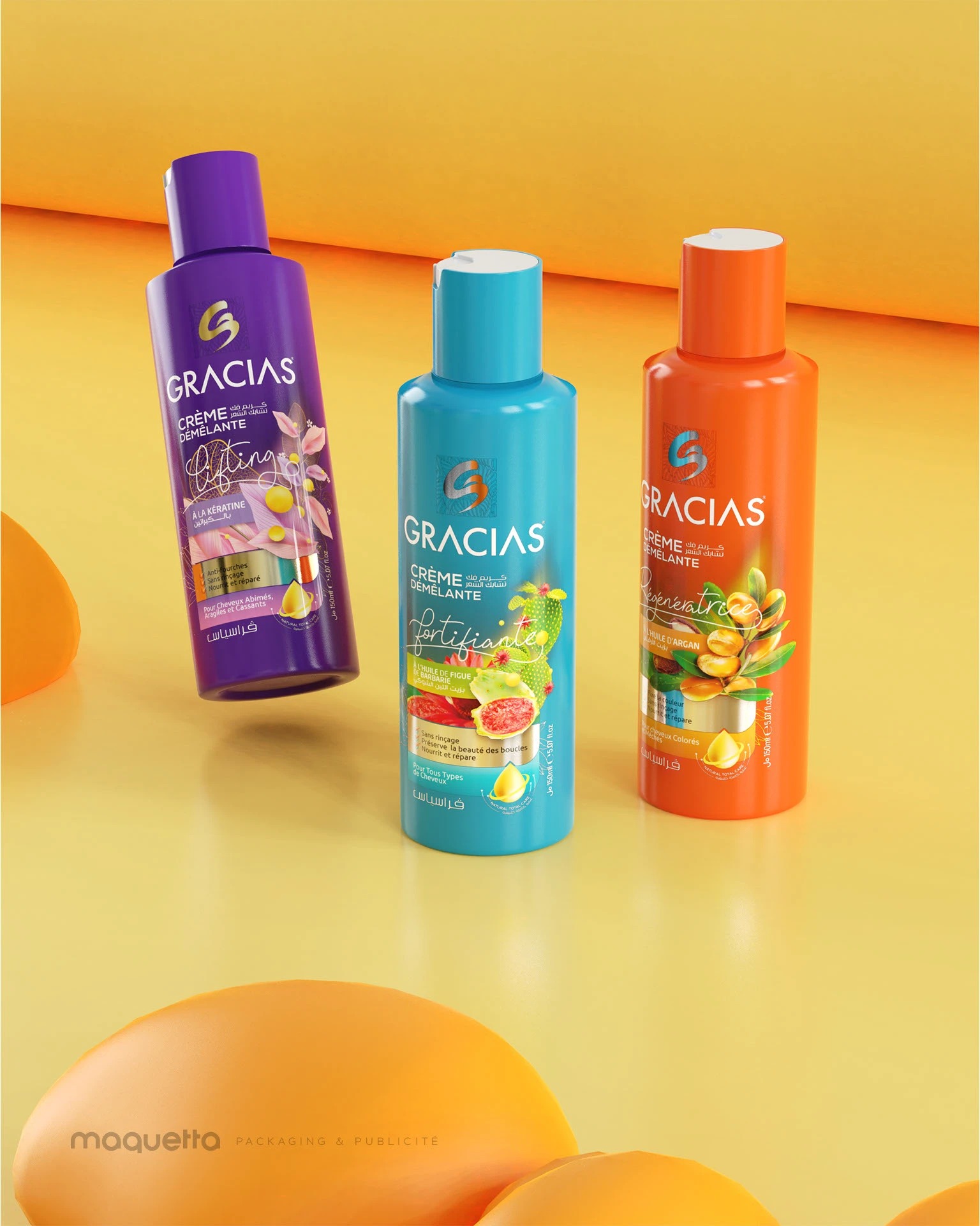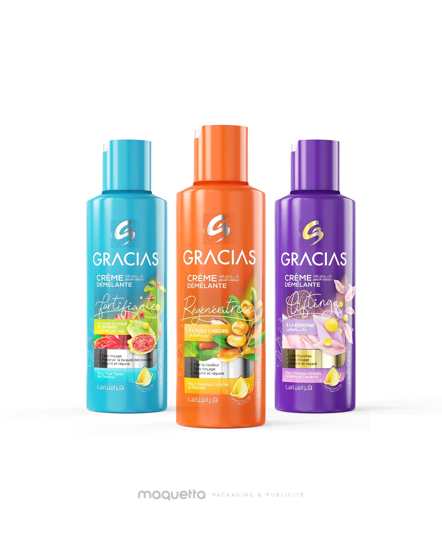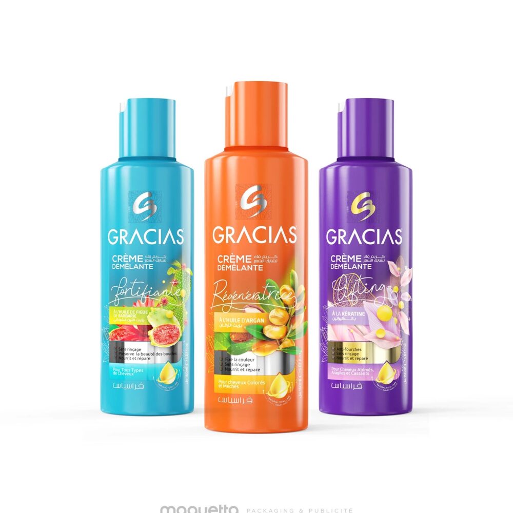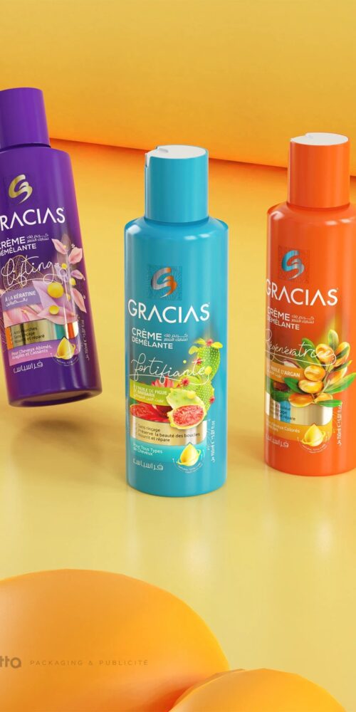 Nous avons créé le design d’étiquette de la crème sans rinçage GRACIAS en développant un univers visuel clair, frais et facile à reconnaître. Chaque variante possède sa propre couleur et ses visuels inspirés des ingrédients, permettant de distinguer rapidement chaque soin tout en gardant une harmonie dans l’ensemble de la gamme. La mise en page met en avant les informations essentielles : le nom du produit, l’actif principal et les bénéfices, avec une présentation lisible et équilibrée. Les illustrations apportent une touche douce et moderne, renforçant la dimension soin et la personnalité de la marque. Ce travail graphique permet à GRACIAS de se démarquer en rayon avec une identité cohérente, attrayante et immédiatement identifiable.
